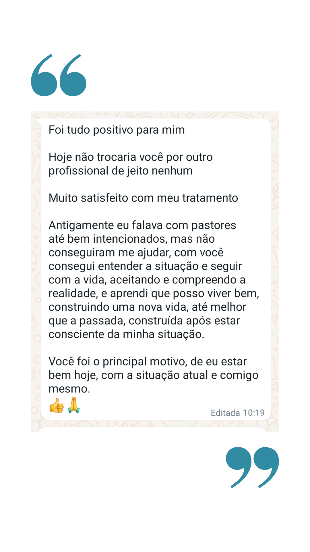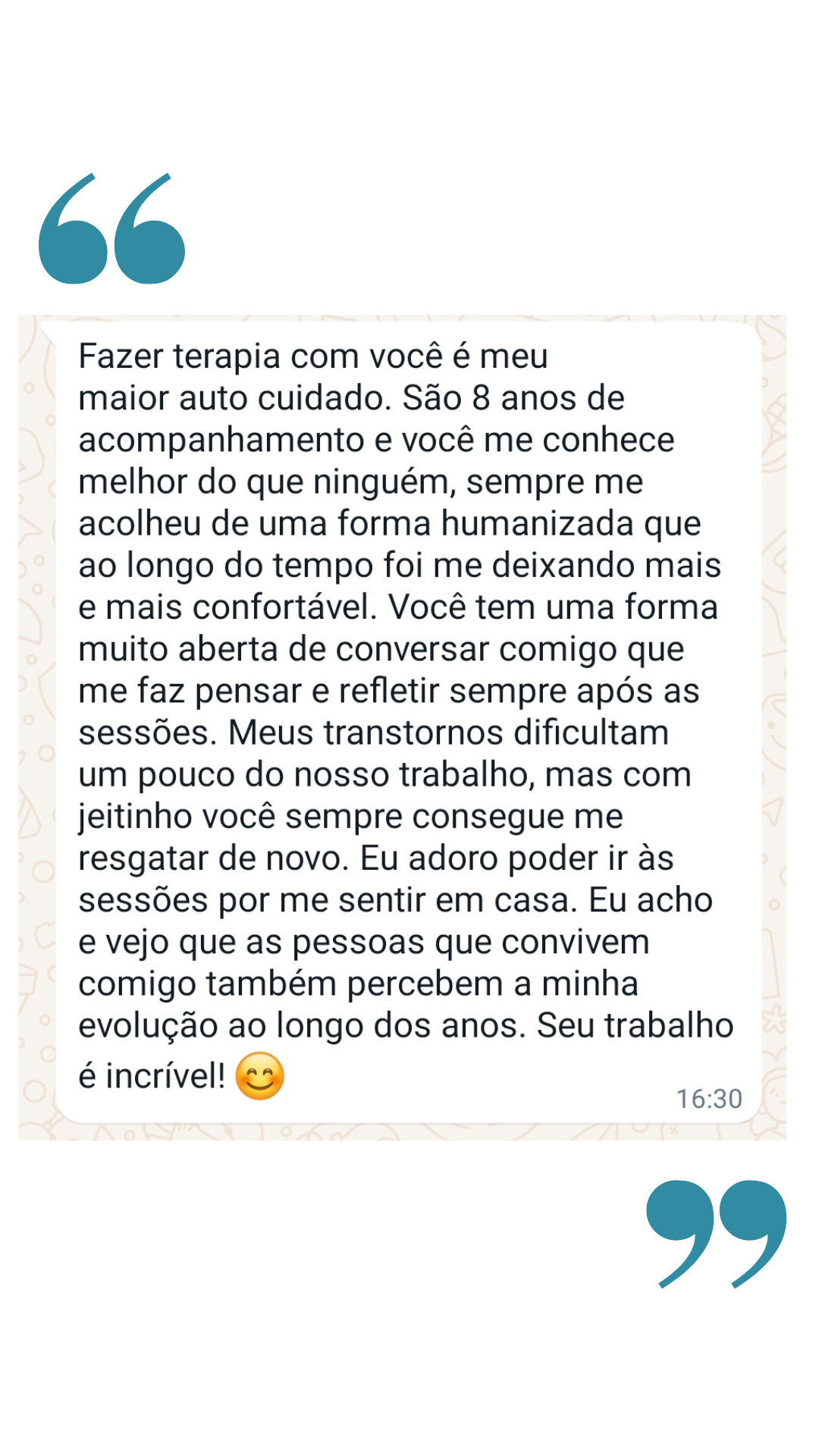 Sou graduado em Psicologia desde 2016 e desde então venho atuando na área clínica com a abordagem da Gestalt-terapia. No meu acompanhamento clínico, busco fornecer um ambiente acolhedor, ajudando as pessoas a restaurarem seu equilíbrio e a se redescobrirem, reconhecendo seu potencial e responsabilidades. Ao longo da minha carreira, trabalhei com adolescentes, adultos e idosos, contribuindo para o desenvolvimento e bem-estar deles.